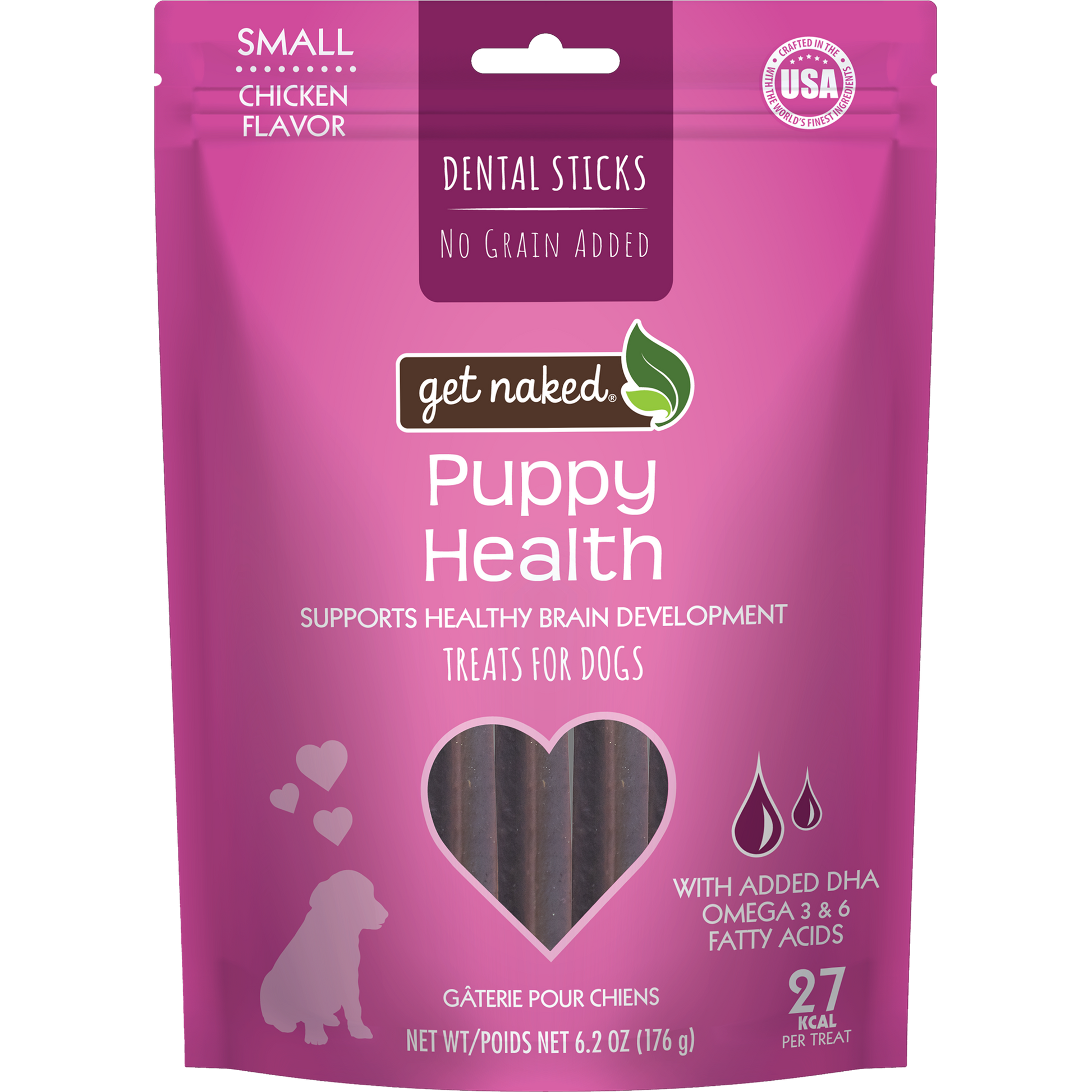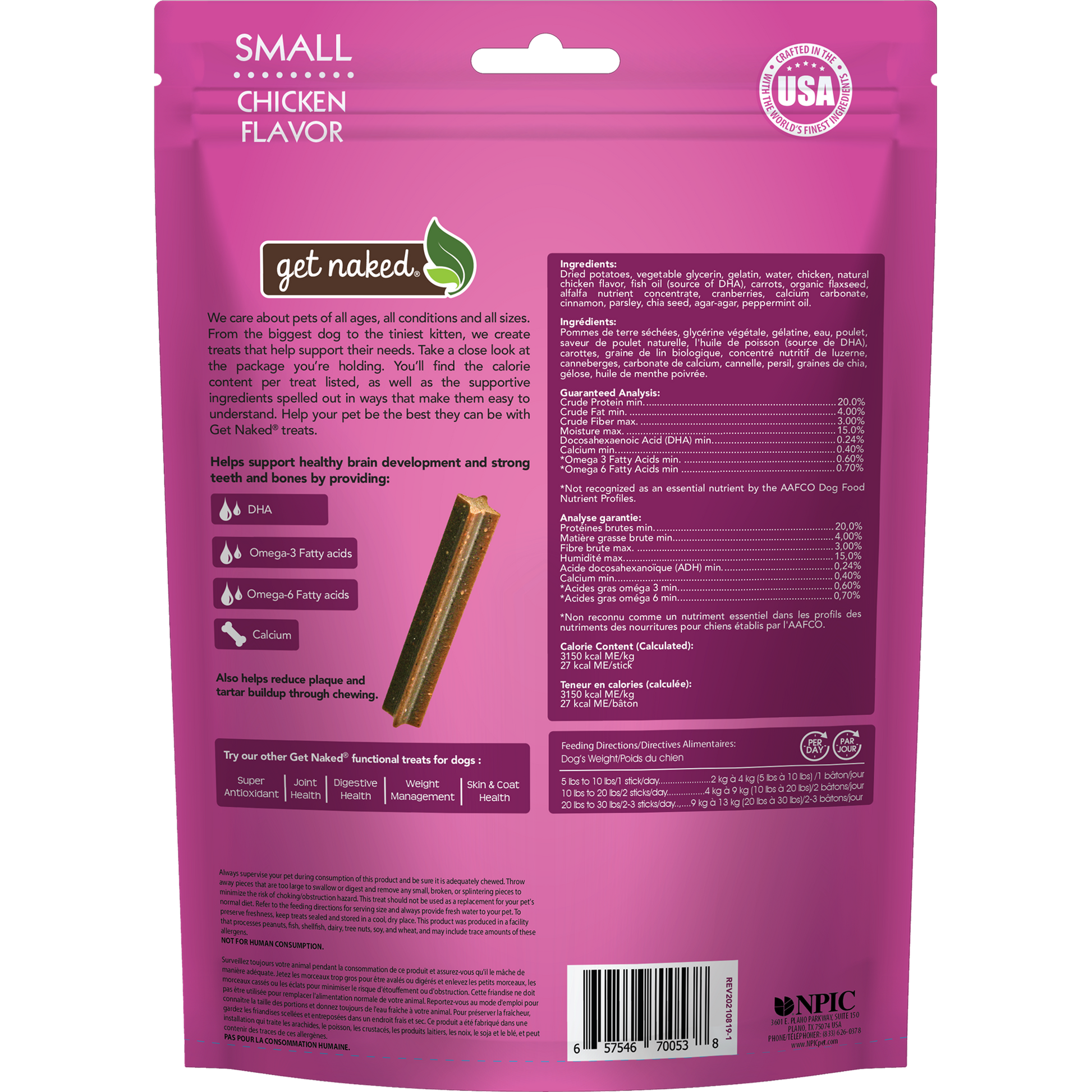 Dried potatoes, vegetable glycerin, gelatin, water, chicken, natural chicken flavor, fish oil (source of DHA), carrots, organic flaxseed, alfalfa nutrient concentrate, cranberries, calcium carbonate, cinnamon, parsley, chia seed, agar-agar, peppermint oil.