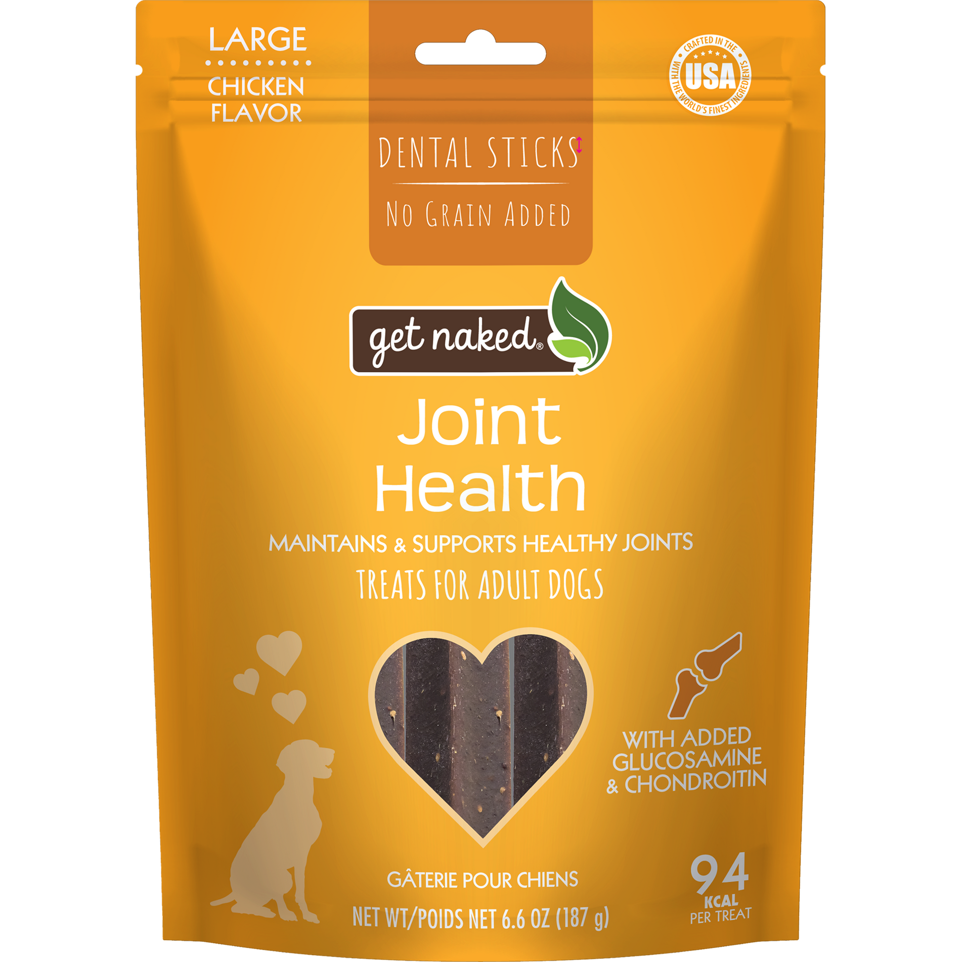 Dogs love to run and play making it important for them to have healthy joints. Get Naked® Joint Health dental chew sticks are grain-free treats fortified with glucosamine, chondroitin, and Omega 3 fatty acids to help support flexibility and mobility in adult and senior dogs. Your furry companion will gain the joint supporting benefits of Get Naked® Joint Health chew sticks, while enjoying the scrumptious chicken flavor.