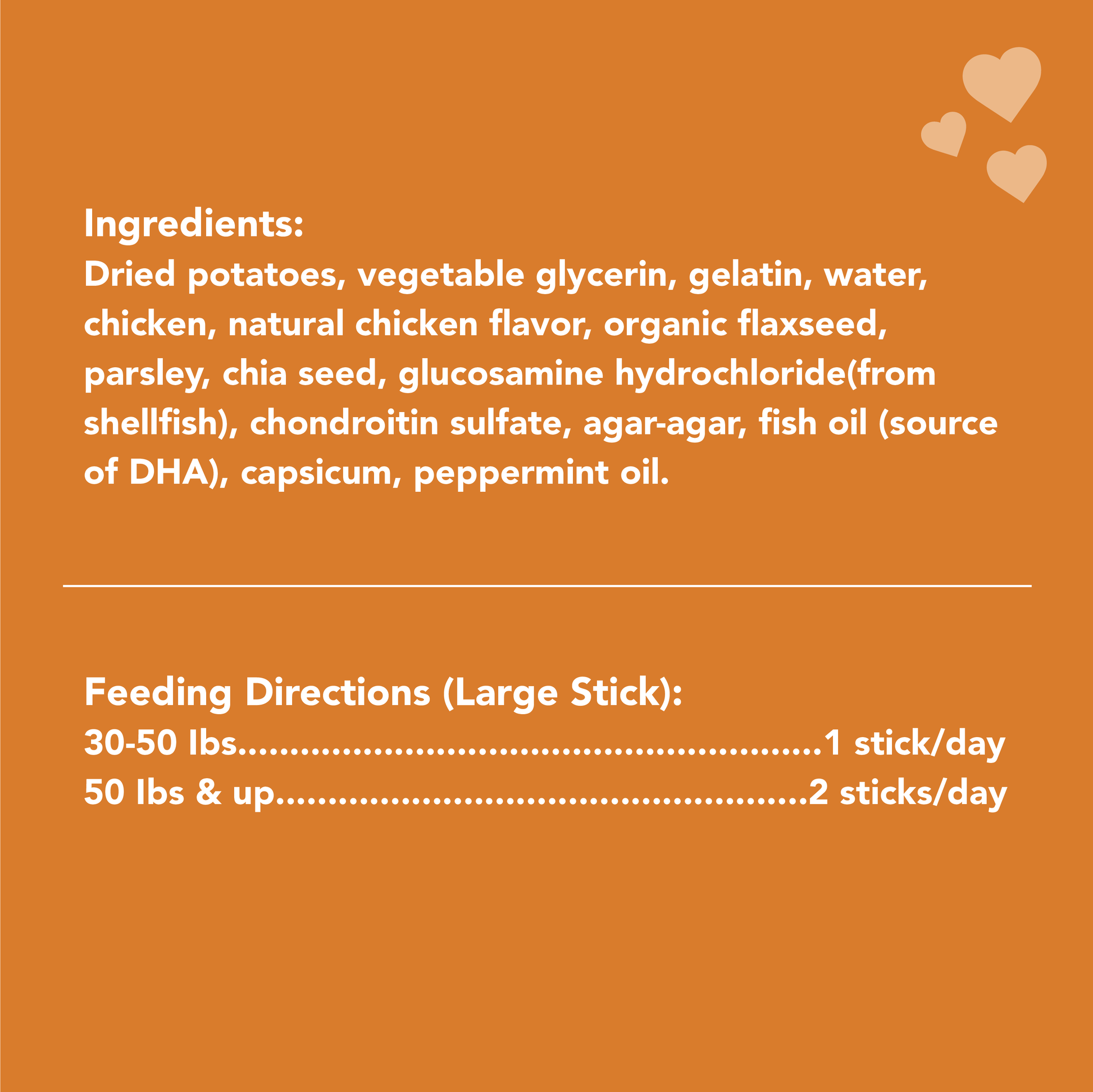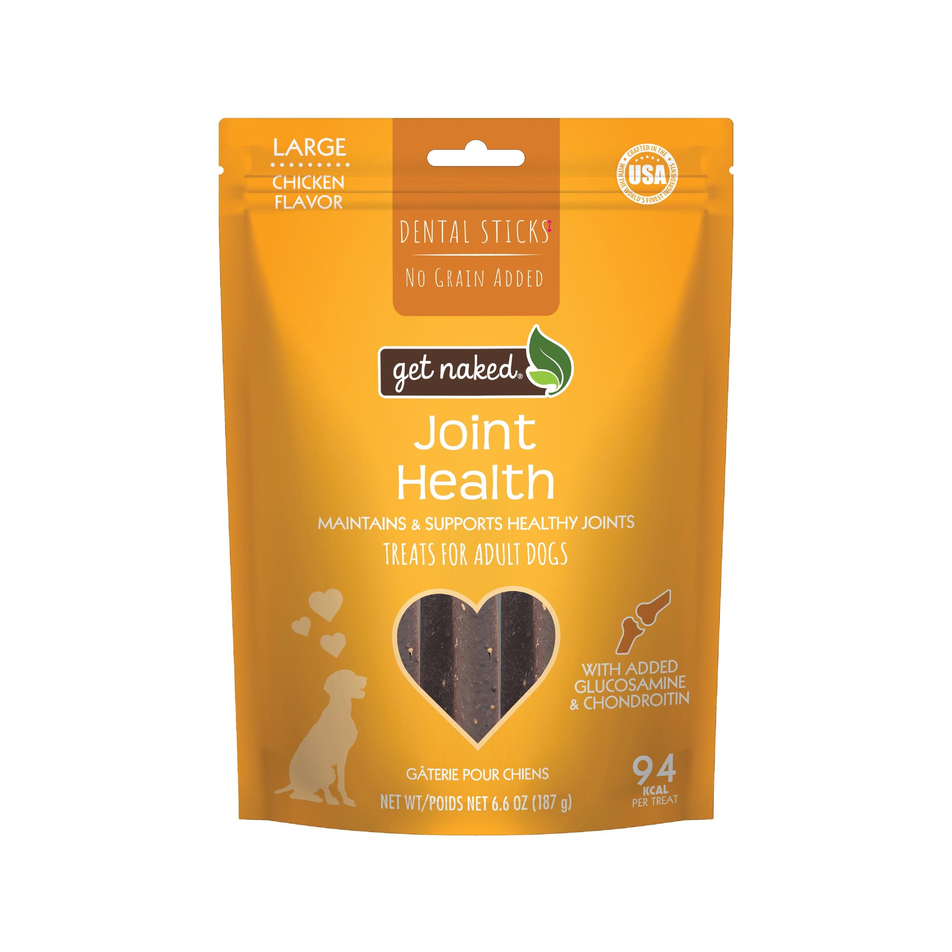 Dogs love to run and play making it important for them to have healthy joints. Get Naked® Joint Health dental chew sticks are grain-free treats fortified with glucosamine, chondroitin, and Omega 3 fatty acids to help support flexibility and mobility in adult and senior dogs. Your furry companion will gain the joint supporting benefits of Get Naked® Joint Health chew sticks, while enjoying the scrumptious chicken flavor.