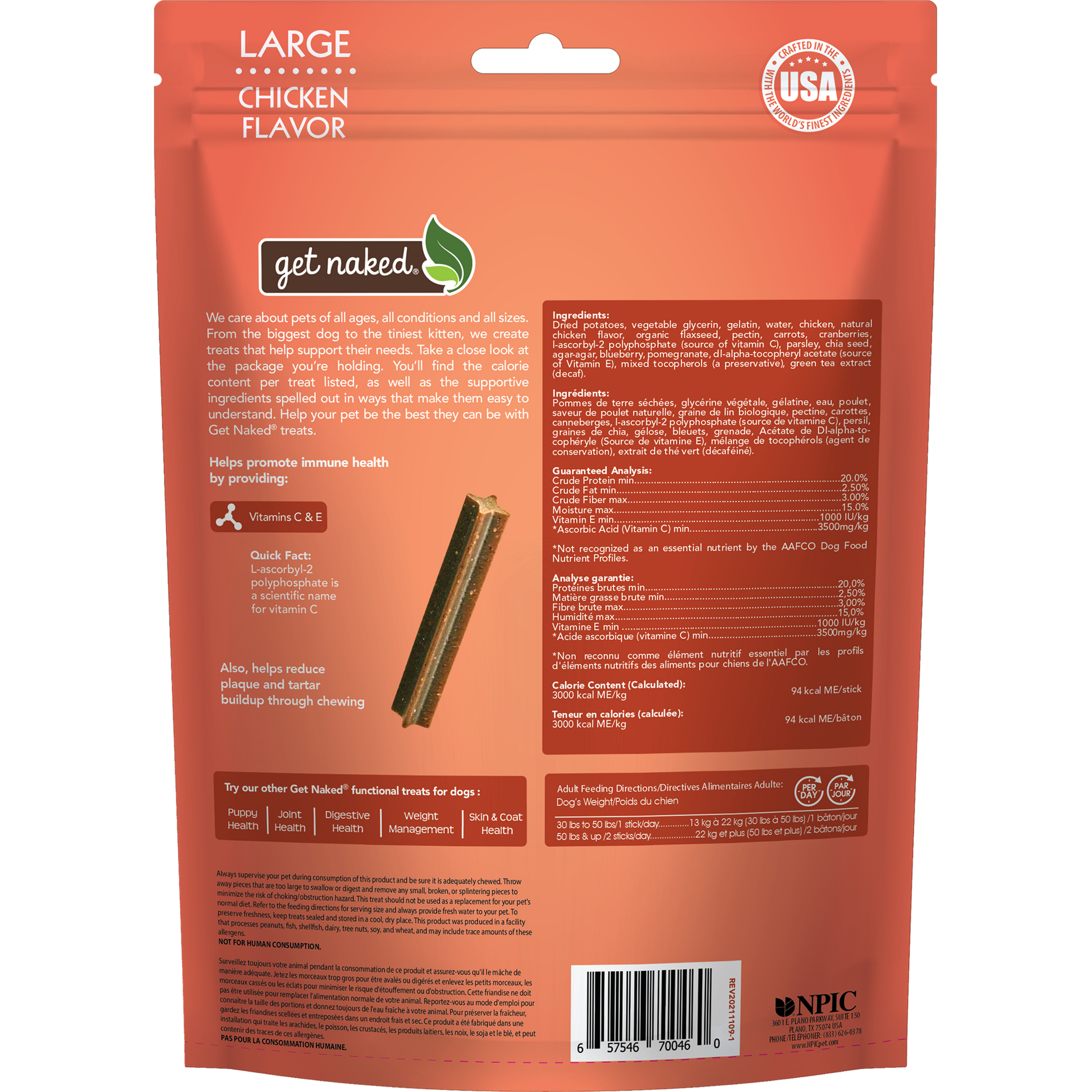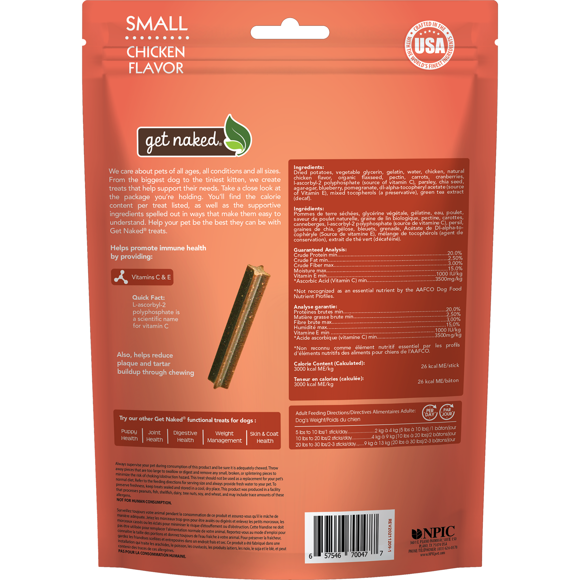 Dried potatoes, vegetable glycerin, gelatin, water, chicken, natural chicken flavor, organic flaxseed, pectin, carrots, cranberries, l-ascorbyl-2 polyphosphate (source of vitamin C), parsley, chia seed, agar-agar, blueberry, pomegranate, dl-alpha-tocopheryl acetate (source of vitamin E), mixed tocopherols (a preservative), green tea extract (decaf).