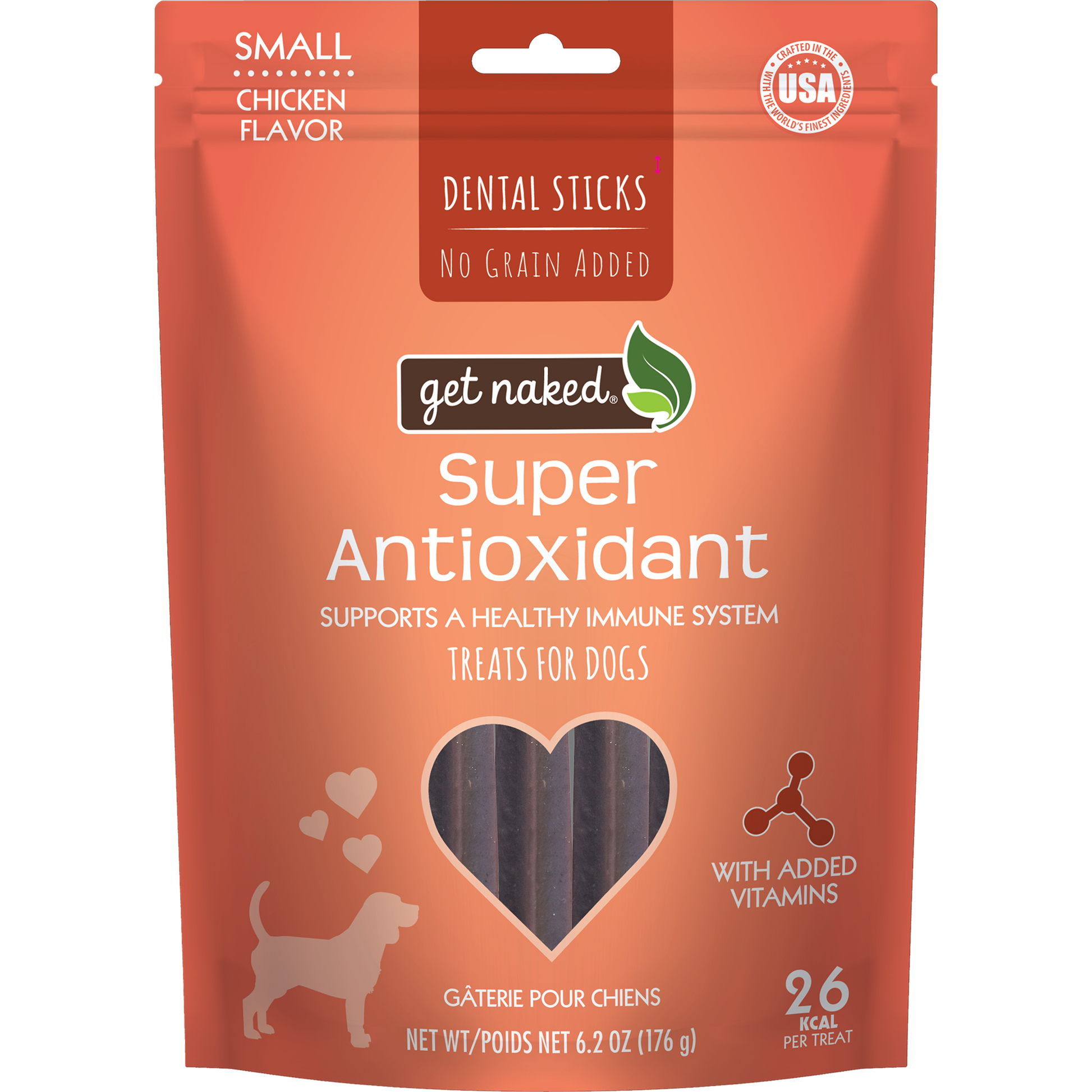 Get Naked Super Antioxidant Dental Sticks are grain-free treats packed with a special blend of antioxidant-rich super fruits and vegetables. Antioxidants are crucial for neutralizing the cell-damaging free radicals that your dog is exposed to on a daily basis. Our Super Antioxidant chew sticks are fortified with vitamins and minerals to further promote good health and overall wellness for your special four-legged family member. Your dog deserves the very best and our tasty chicken flavored chew sticks are sure to satisfy their cravings while delivering an abundance of healthy ingredients.
