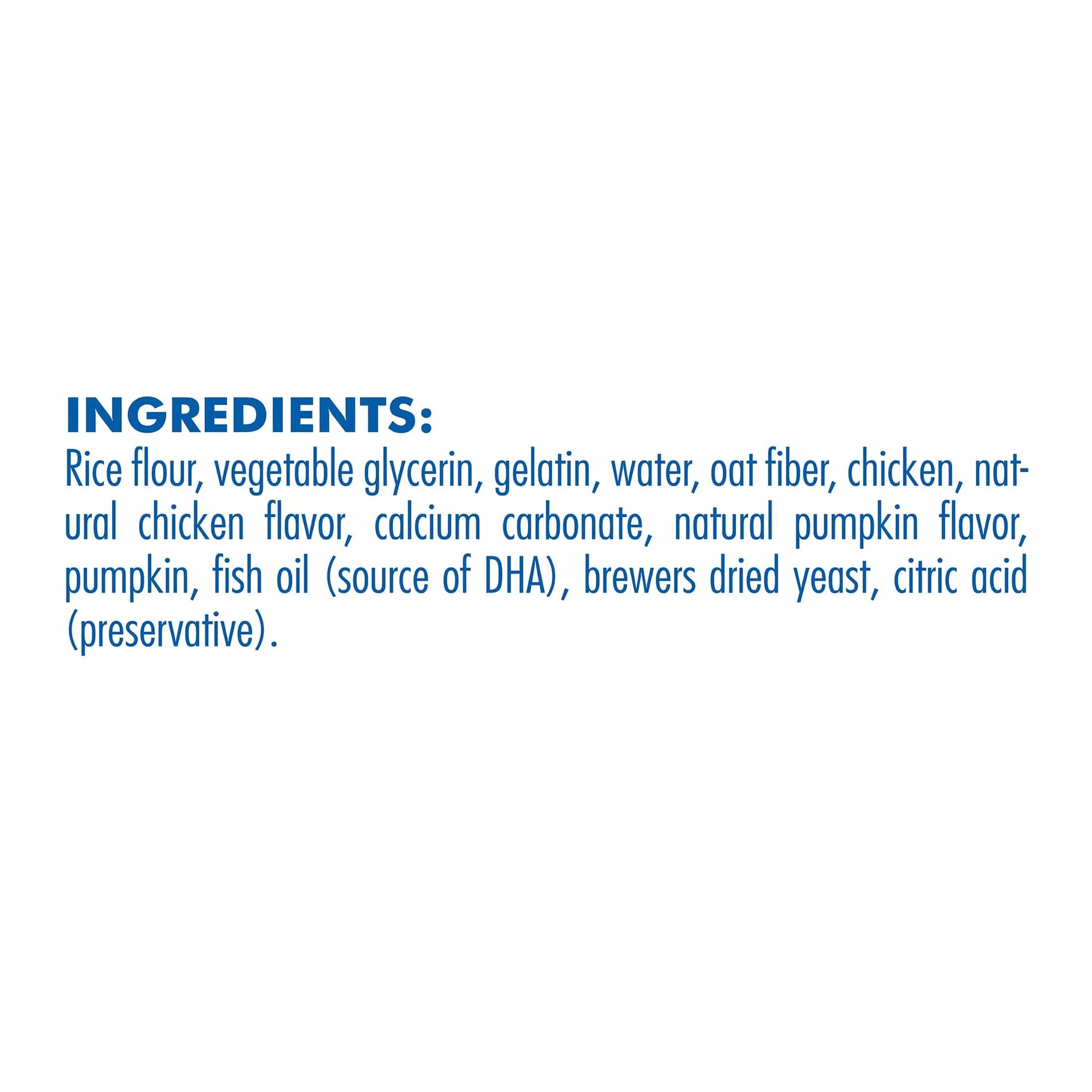Rice Flour, Vegetable Glycerin, Gelatin, Water, Oat Fiber, Chicken, Natural Chicken Flavor, Calcium Carbonate, Natural Pumpkin Flavor, Pumpkin, Fish Oil (Source Of Dha), Brewers Dried Yeast, Citric Acid (Preservative).