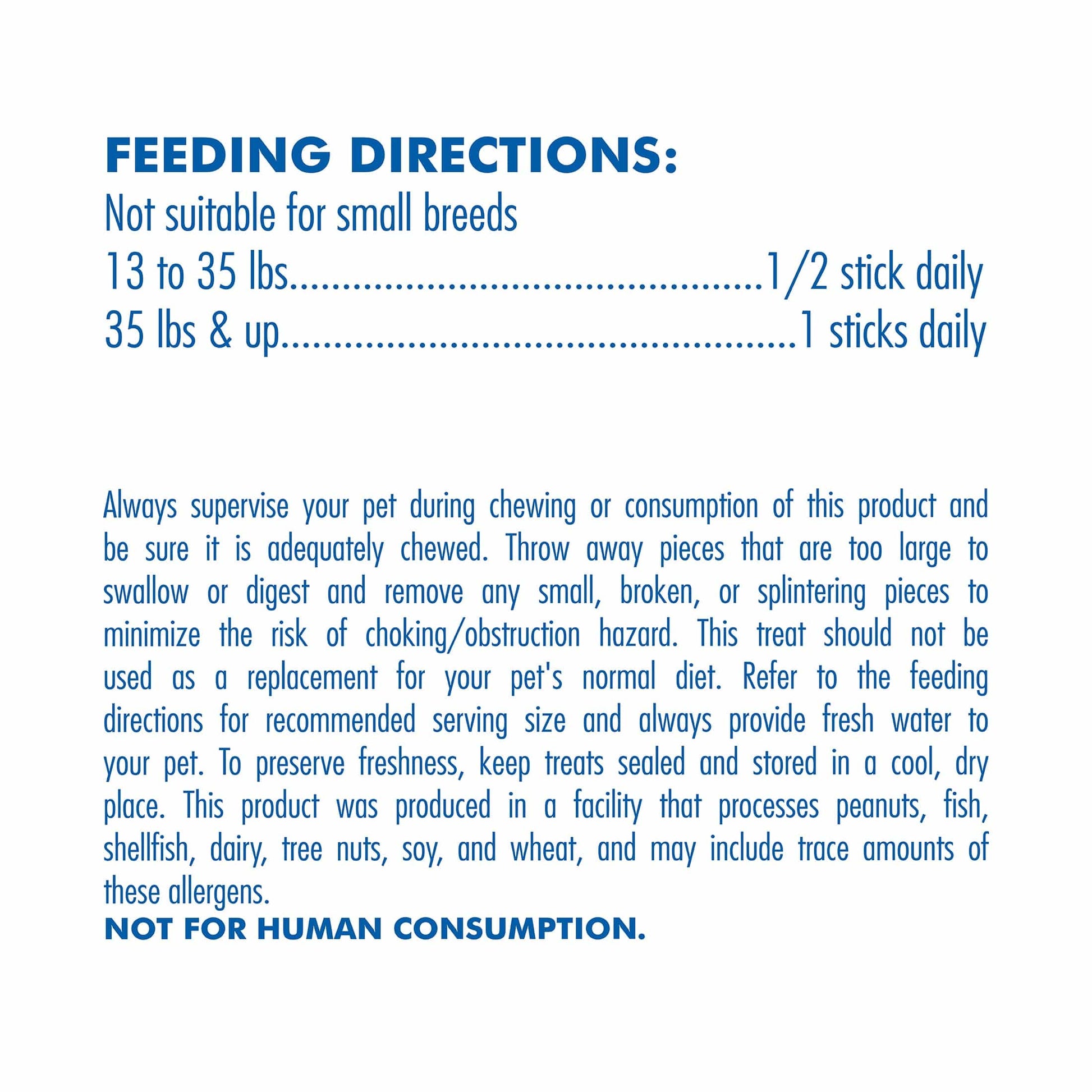 Supervise your pet at all times during chewing or consumption of this product and be sure it is adequately chewed. Throw away pieces that are too large to swallow or digest and remove any small, broken or splintering piece to minimize the risk of choking/obstruction hazard. This treat should not be used as a replacement for your dog's normal diet. Refer to the feeding directions for recommended serving size and provide fresh water to your pet at all times. To preserve freshness, keep treats sealed and stored in a cool, dry place. This product was produced in a facility that processes allergens such as peanuts, soy, wheat, milk, fish, and shellfish, and may include trace amounts of these allergens.