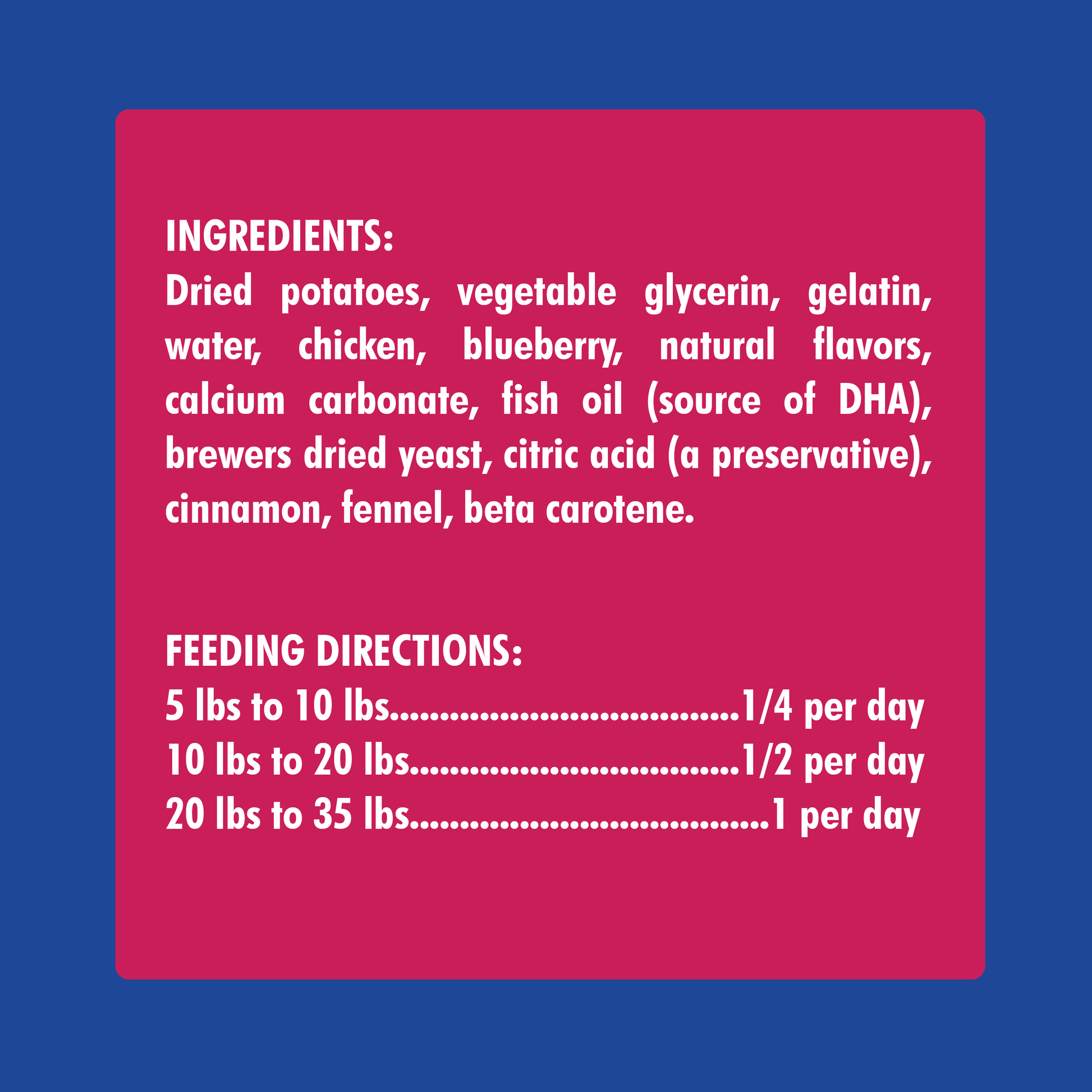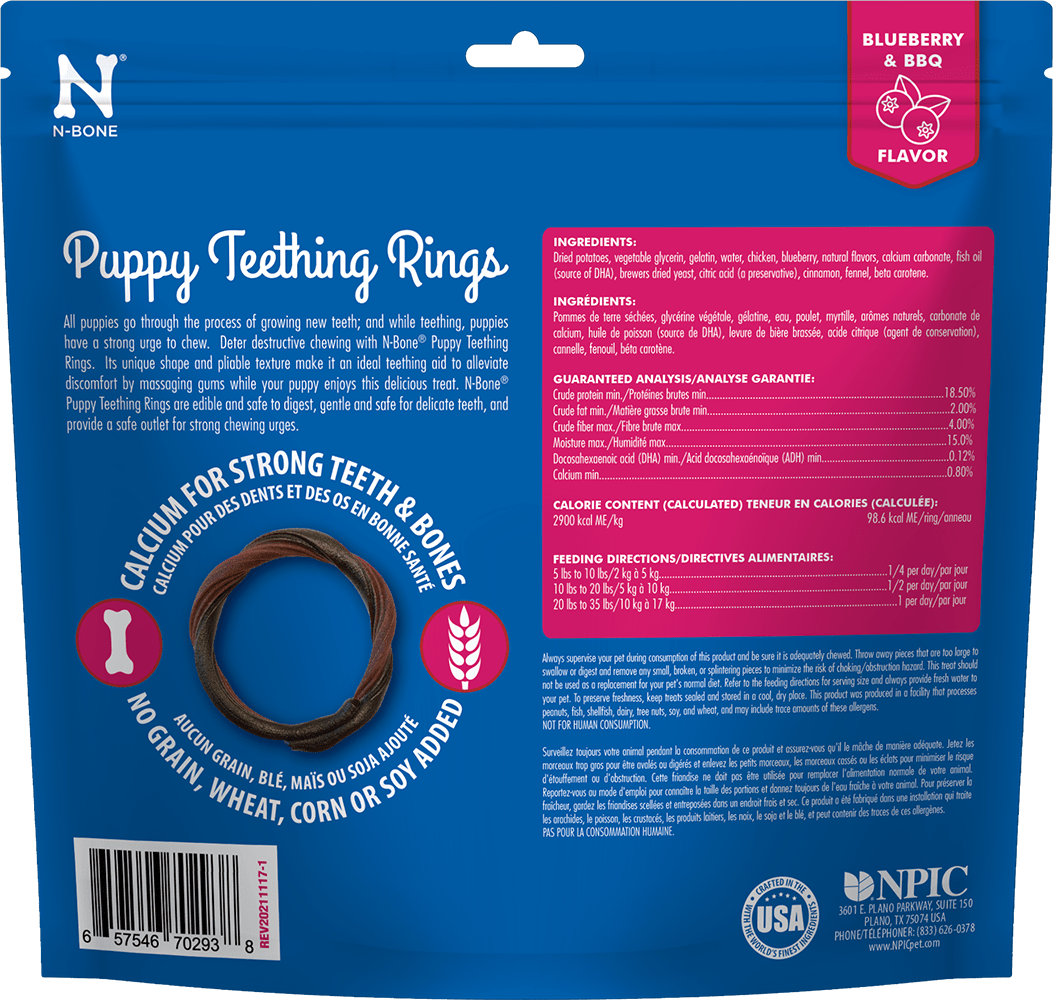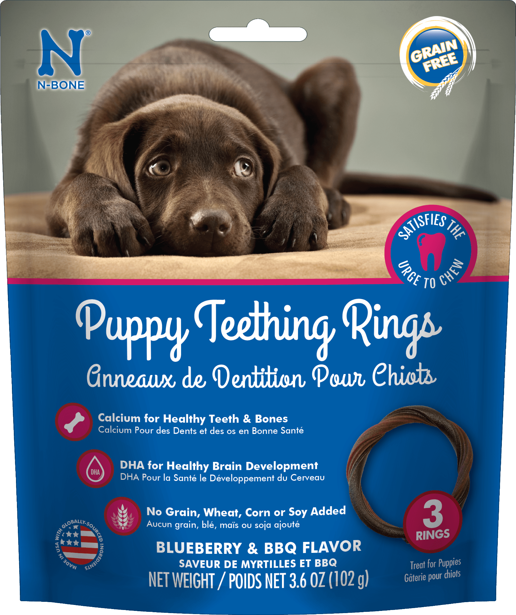 Growing new teeth is tough work and it makes for some sore gums! Sore gums and a strong urge to chew while cutting new teeth can turn your precious puppy into a whirlwind of destruction. N-Bone® Puppy Teething Rings Grain-Free are easy for floppy puppy paws to hold onto and provide a soothing and appropriate outlet for chewing. Formulated with DHA and calcium to support your puppy’s unique nutritional needs, our delicious grain-free blueberry & bbq flavored rings are pliable and won’t damage immature teeth or upset tummies that have gluten sensitivity.