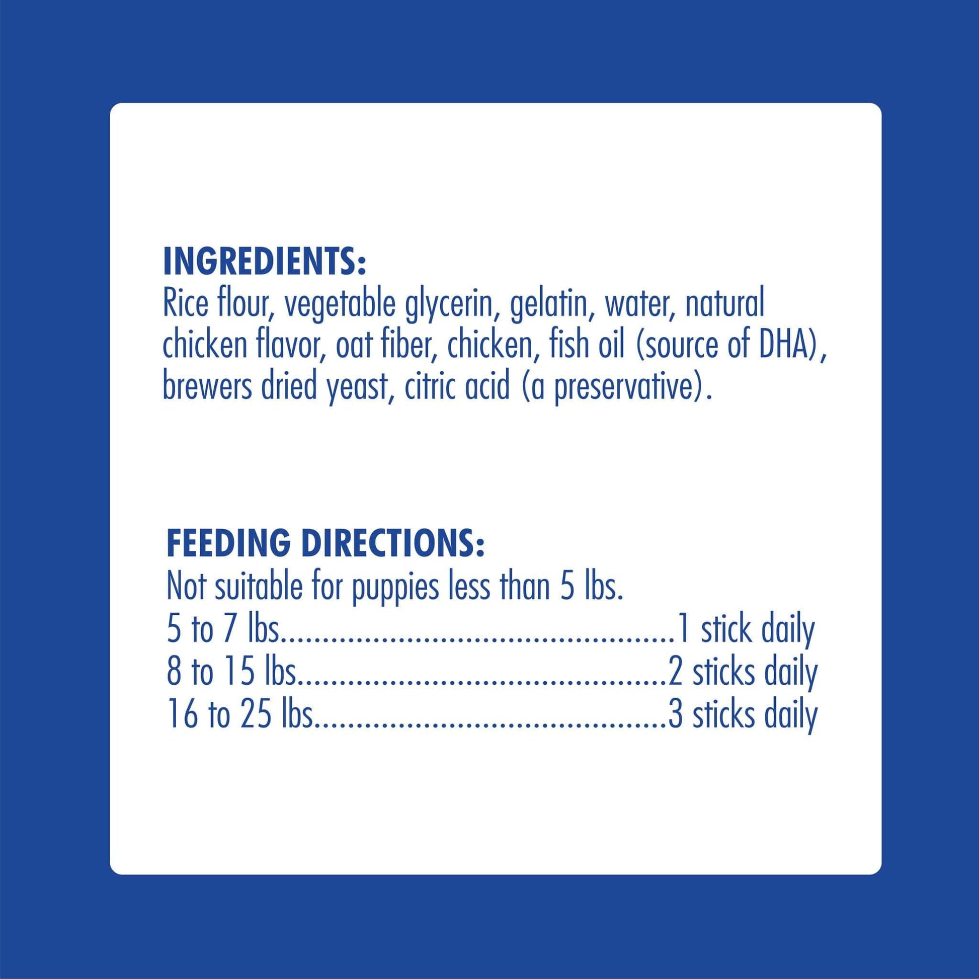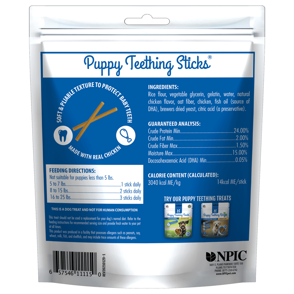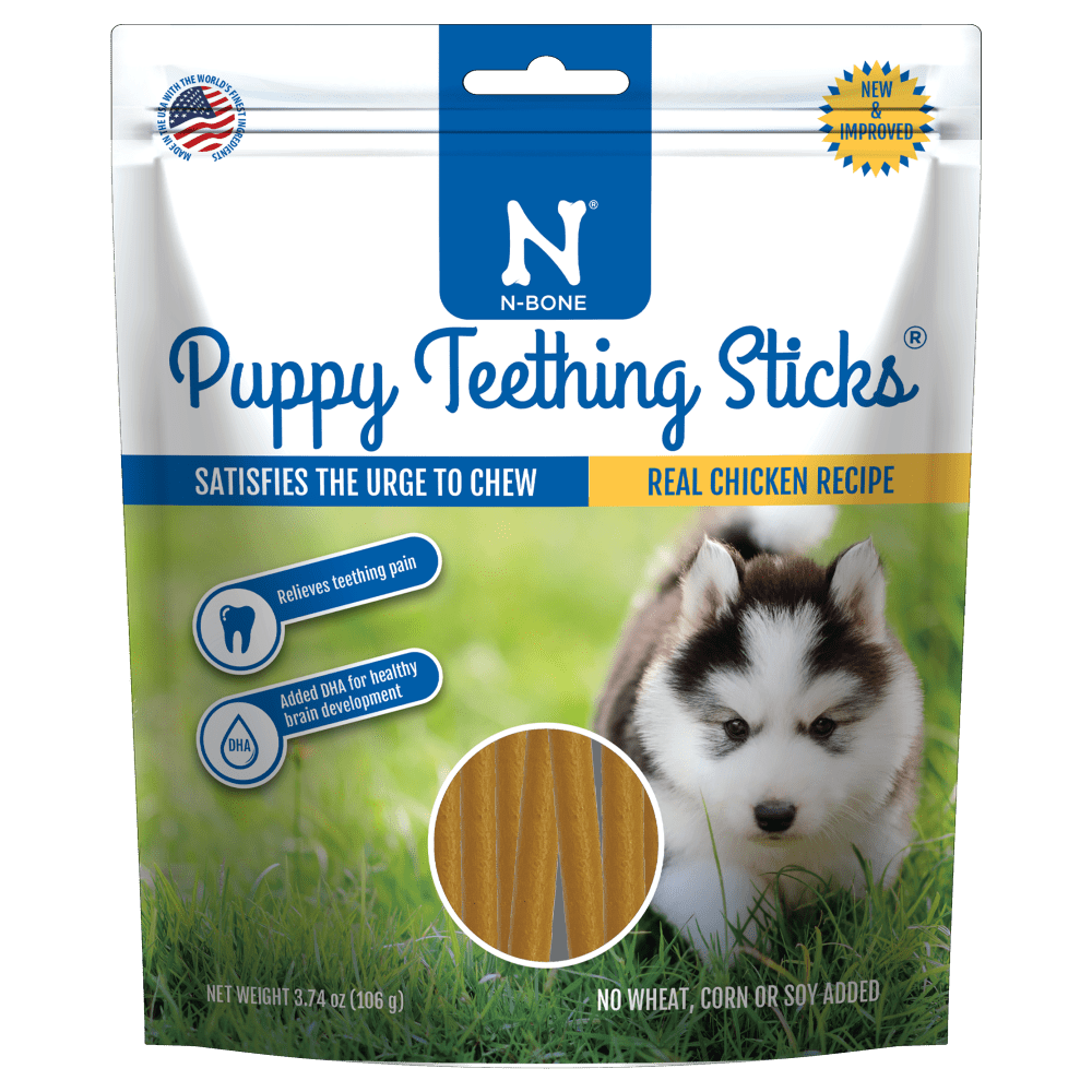 Just like babies, puppies experience pain and discomfort while teething. The chewing process helps alleviate the pain, but the endless chewing of a teething puppy can cause inappropriate destruction of property. If they chew on something too hard, it could cause damage to your puppy’s new teeth! Damage to baby teeth can cause dental issues later in life. N-Bone® Puppy Teething Sticks help satisfy your puppy’s chewing urges. They provide a non-destructive outlet for chewing while protecting immature teeth and all of the household items within gnawing range. Specially formulated to be soft and pliable, our delicious treats will soothe your puppy’s sore gums and promote good dental health. N-Bone® Puppy Teething Sticks are the safe and natural way to help your puppy through the teething stage.