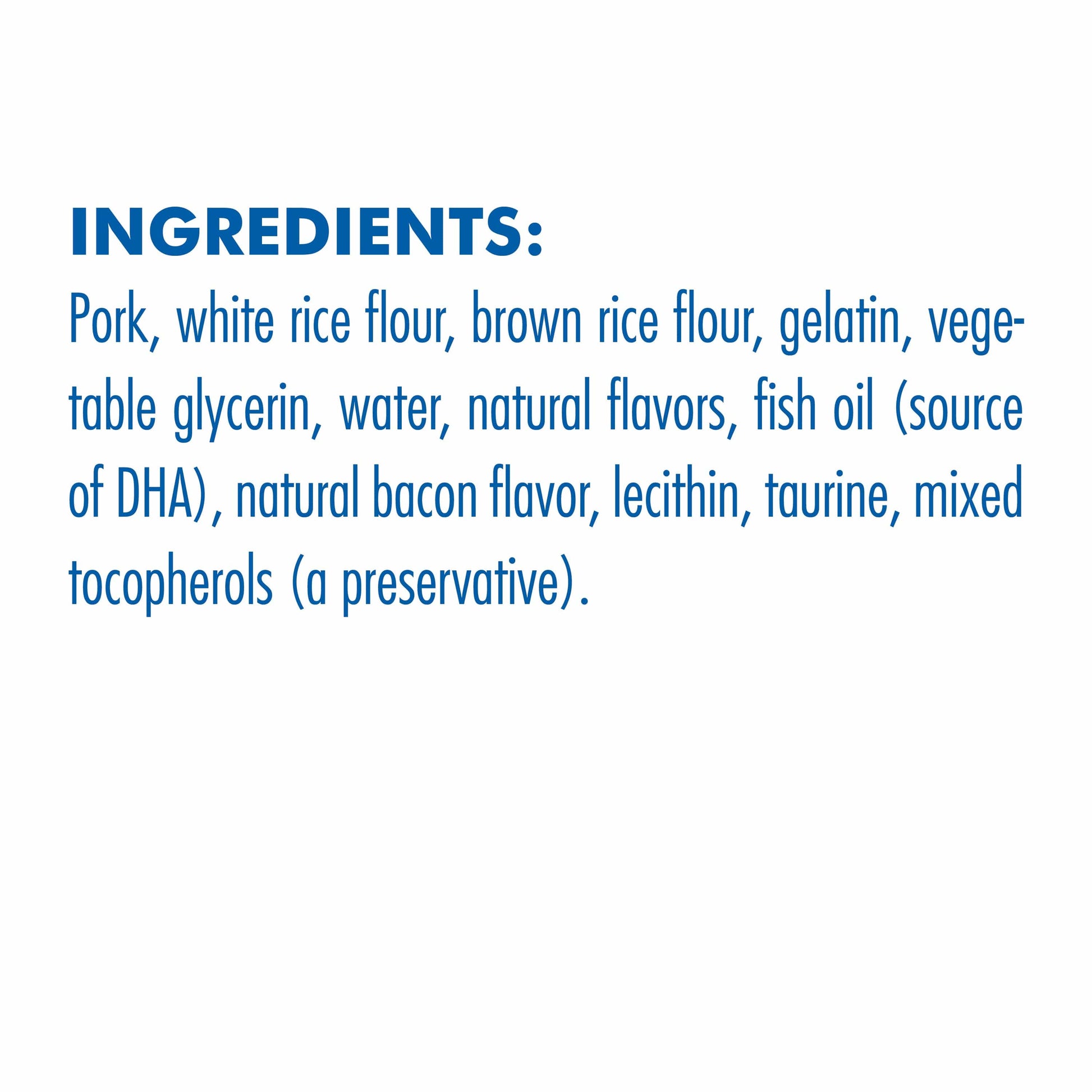 Wheat gluten, corn starch, vegetable glycerin, gelatin, water, cordn gluten meal, pork, herring oil (preserved with mixed tocopherols), natural bacon flavor, lecithin, ginger, taurine, rosemary extract, mixed tocopherols (a preservative).